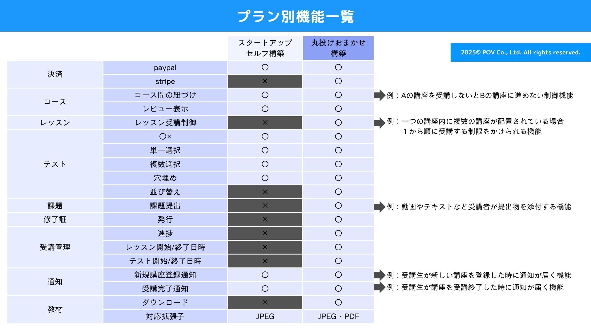株式会社POV オンライン学習システム 初期導入費用0円~! あなたのお悩み… オンライン学習システム(LMS)で 解決しませんか? 日々の業務に追われて自分の時間が作れない… 稼働していないと収入が減ってしまう… 人を育てたいけど、時間がない… MERIT LMSのメリット メリット1:24時間あなたの代わりに働き続けてくれる LMSは、あなたが稼働していない時間でも常に必要とする人に情報を届けてくれます。 リアルの研修に付加価値をつけたり、販売をすることで収益をアップする事も可能になります! メリット2:世界中どこでも学びを届けられる LMSは、地理や時間の壁を超え、世界中に学びを届けられます。あなたの知識や経験が、地球のどこかで誰かの成長に繋がります。 だからといって… LMSを導入するには 想像以上にコストがかかるし… 自分で制作するのは時間もかかるし難しそう… それ、ULearningがお役に立てます。 About ULearningとは? ”圧倒的低価格”をコンセプトに作られたオンライン学習システム 「LMSを導入したいけど、高すぎて…」「こんなにたくさん機能なくていいのに…」そんなお声から生まれたUlearning。 余分な機能を省いて、ユーザーにあわせたカスタマイズが可能です。 プランは全3種類。ご希望にあわせたプランをお選びください。 お問い合わせはこちらから PLAN ULearningプラン #01 スタートアッププラン 動画マニュアルを見ながらご自身で構築を行っていただくプラン。 余分な機能を省き、基本機能のみを搭載しています。Paypal決済による講座販売にも対応しているので、低コストでeラーニング販売を始めたい方に最適です。 初期導入費用:0円 月額利用料:5,400円(税抜) #02 丸投げおまかせ構築プラン トップページ及び2講座・20テストまでの設置代行付プラン。スタートアッププランの機能に加え、stripe決済・修了証発行・受講管理等eラーニングに必要な様々な機能を搭載しています。 初期導入費用:800,000円(税抜) 月額利用料:5,400円(税抜) 公式LINEご登録特典 LINE公式お友達限定のクーポンをゲットしよう! 公式LINEでは、eラーニングに関する様々な情報を配信しています。 公式LINEお友達限定のお得なクーポンも配布しています。 是非、ご登録ください! お問い合わせ このフォームに入力するには、ブラウザーで JavaScript を有効にしてください。お名前 *会社名:屋号メールアドレス *お問い合わせ内容 *この内容で送信する 会社情報 住所 神奈川県横浜市保土ヶ谷区岩井町11-909 電話番号 045-459-9081 営業時間 10:00-18:00 土日祝日定休 各事業web eラーニング動画制作・導入サポート